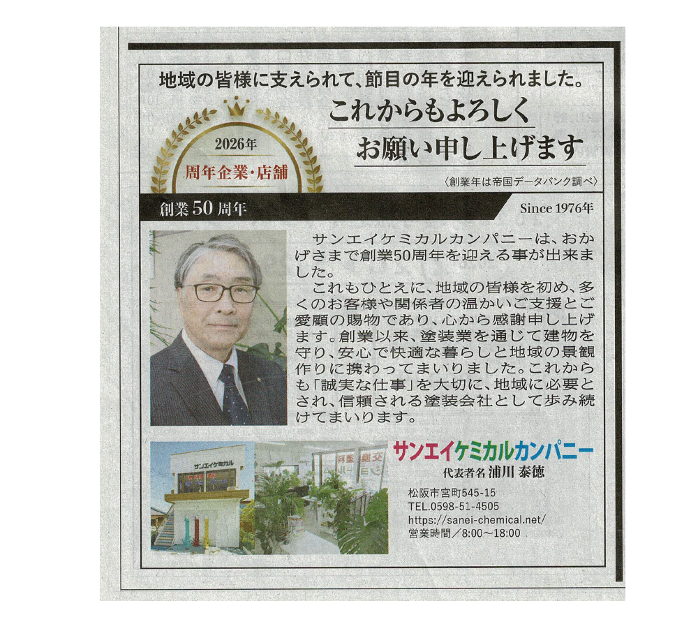 2026年2月24日 夕刊三重「2026年周年企業・店舗」に掲載されました。 PDFファイルでもご覧いただけます。